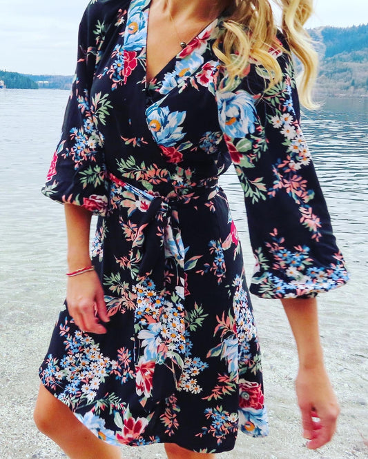 Sparrow & Lilly Black Floral Long Sleeve Wrap Dress