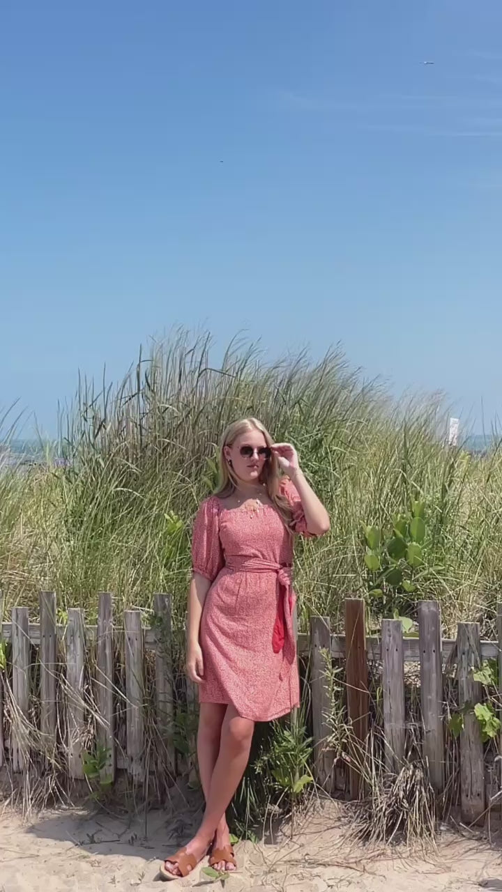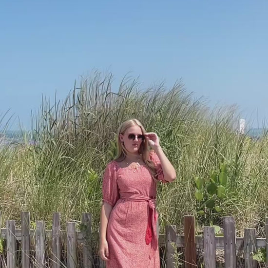 Effortlessly feminine and flattering, this red floral dress is perfect for Summer to Fall transitional days. Designed with a soft square neckline and charming puff sleeves, it balances comfort with timeless style. The adjustable waist tie cinches beautifully, highlighting your shape. A subtle floral print adds a playful yet chic touch, making it an easy choice for everything from picnics to seaside strolls. Wear it 2 ways! For warmer weather, tied in a bow at the back. For cooler weather, crossover back wrapped around and tied in the front. (Styled with the Aloha Charm Necklace and Tahiti Pearl Earrings)