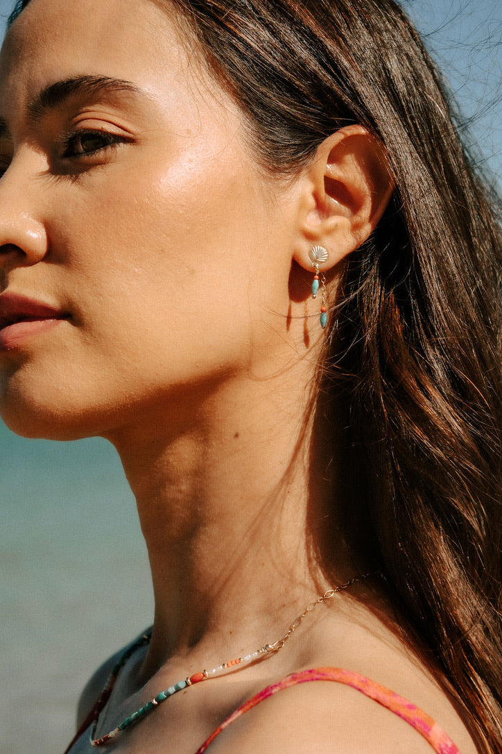 Styled with the Tahiti Necklace and earrings in turquoise and pink coral.