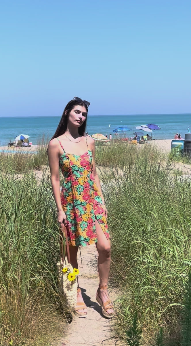 Turn heads this season in our vibrant tropical floral market dress – the ultimate warm-weather essential. Featuring a bold all-over floral print in fiery reds, sunny yellows, and lush greens, this dress is made for carefree days and breezy nights.